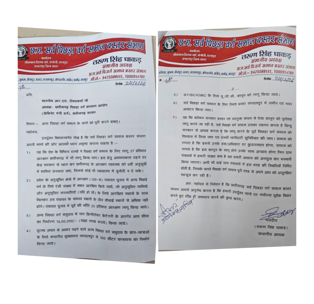 24/02/2026 को छ.ग. सर्व पिछड़ावर्ग समाज बस्तर संभाग के अध्यक्ष तरुण सिंह धाकड़ के नेतृत्व में समाज प्रमुखों के साथ प्रदेश के पिछड़ावर्ग कल्याण आयोग के अध्यक्ष माननीय श्री आर.एस.विश्वकर्मा (सेवानिवृत्त आई.ए.एस) और आयोग के सदस्यों से भेंट कर चर्चा किया गया और सर्व पिछड़ावर्ग समाज के प्रमुख एवं सात सुत्रीय मांगों को लेकर ज्ञापन दिया गया।